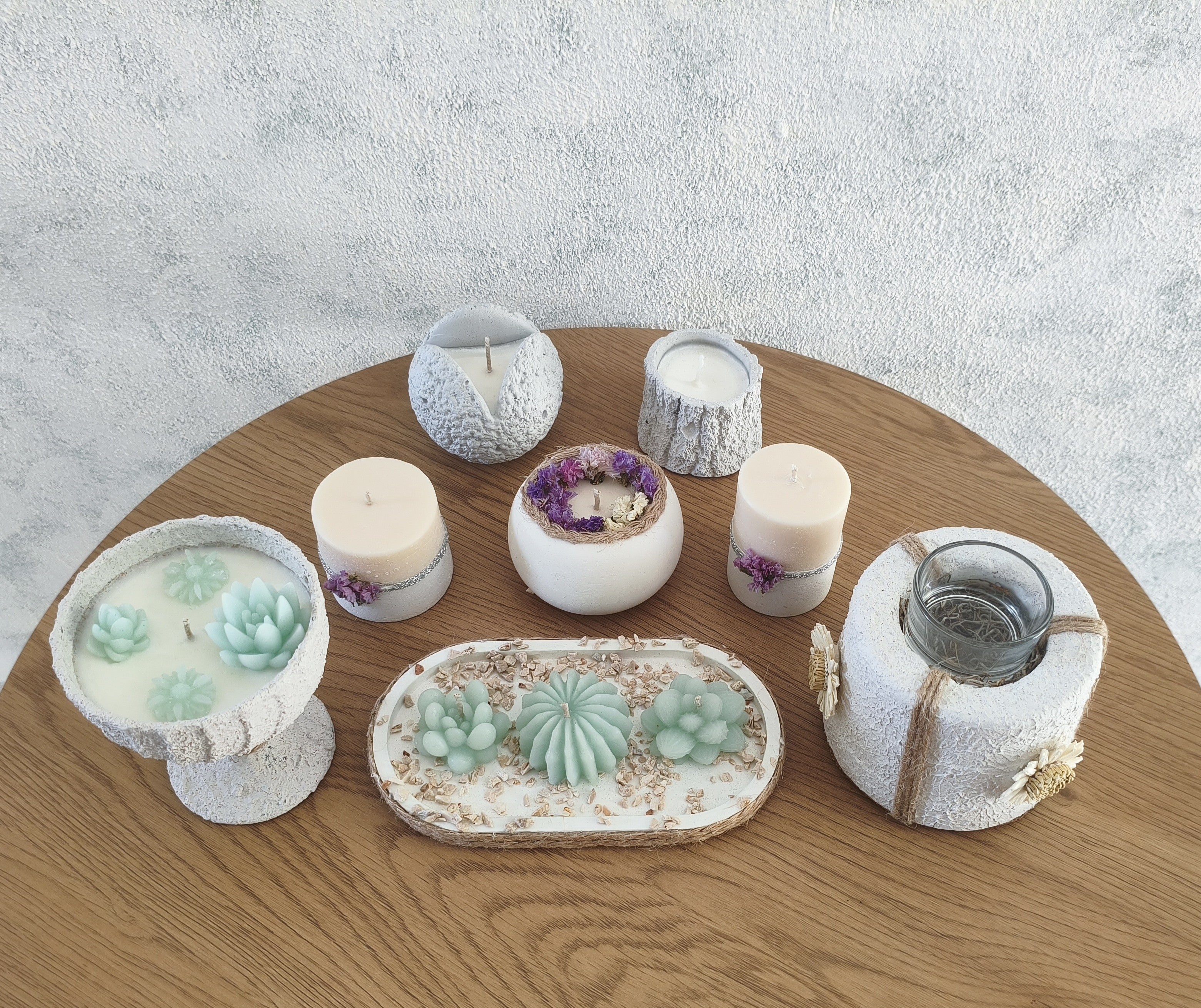 Διακοσμητικό με αερόφυτο,παχύφυτο και κερί σόγιας σε τσιμεντένια βάση