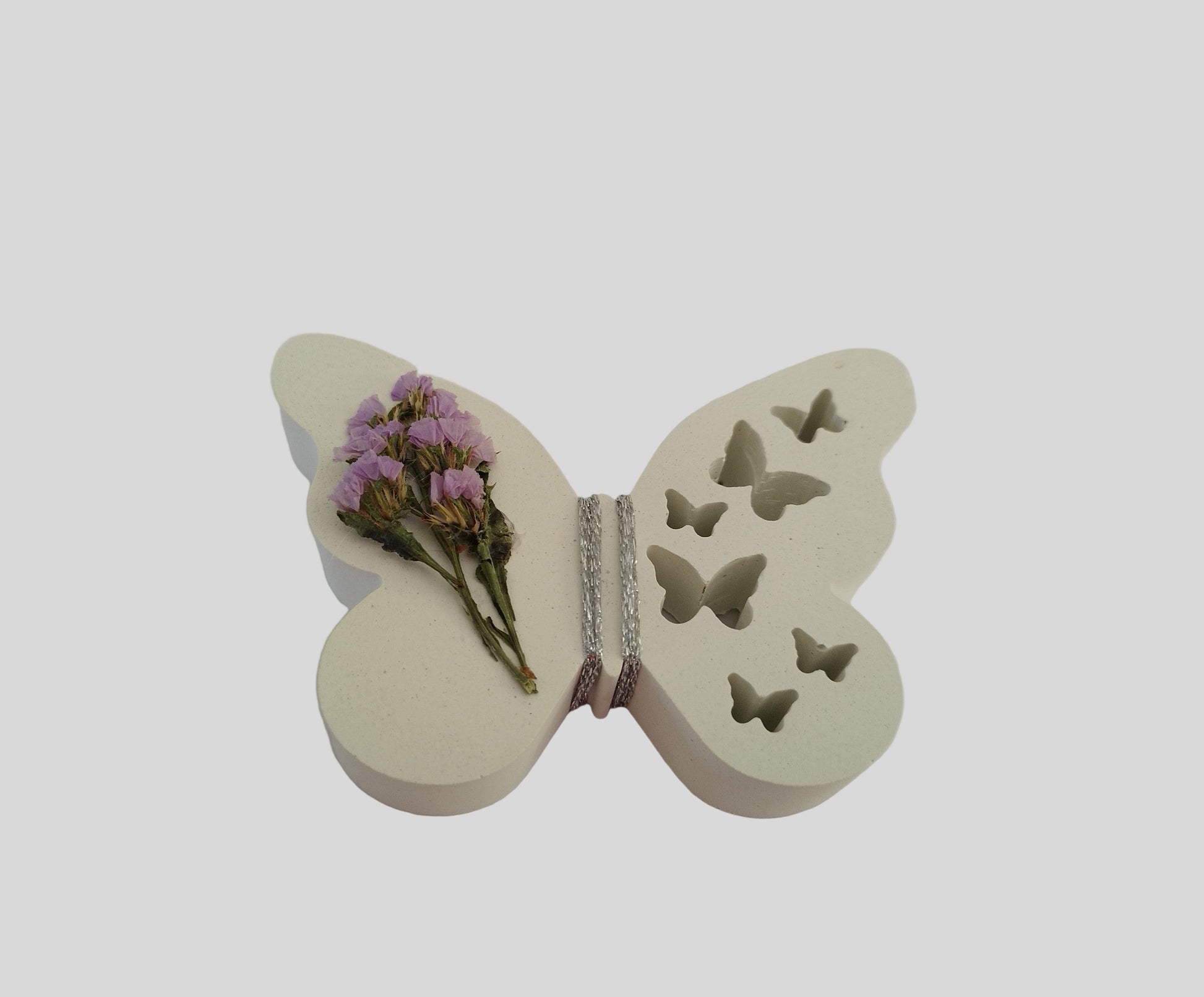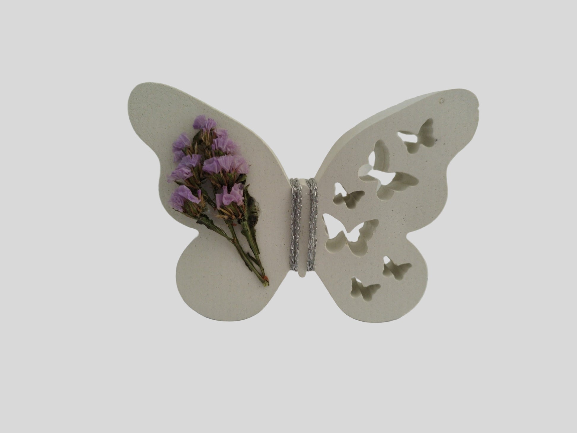 Χειροποίητη τσιμεντένια πεταλούδα, διακοσμημένη με ένα μικρό αποξηραμένο λουλούδι. Μια μίνιμαλ αλλά ρομαντική λεπτομέρεια για το σπίτι.