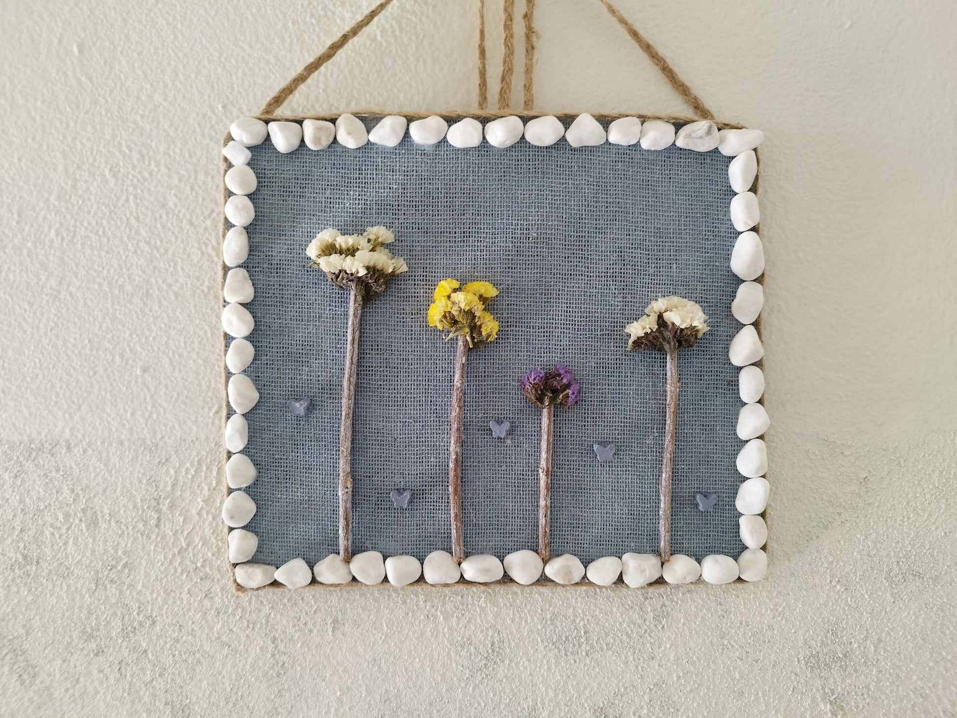 Καδράκι από φελλό διακοσμημένο με λευκές πετρούλες, αποξηραμένα λουλούδια και τσιμεντένιες πεταλούδες. Ένα κομμάτι που συνδυάζει φυσικά στοιχεία με χειροποίητη τέχνη.