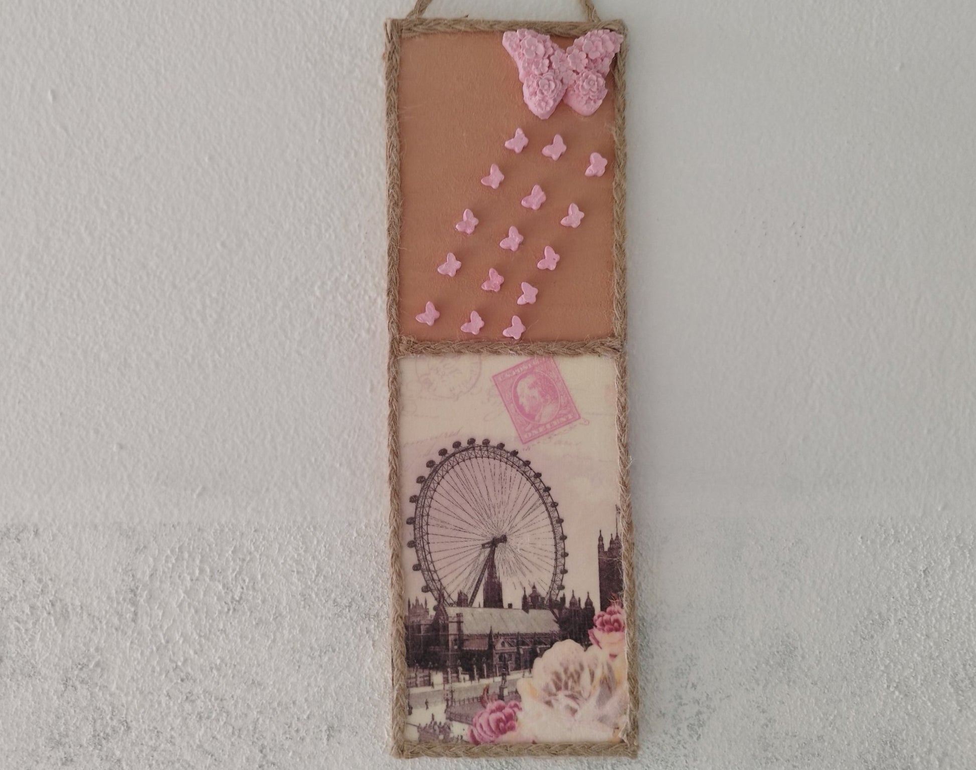 Ξύλινο καδράκι τοίχου με ντεκουπάζ στο κάτω μέρος, διακοσμημένο περιμετρικά με σχοινί και τσιμεντένιες πεταλούδες στο επάνω μέρος. Ένας ιδιαίτερος συνδυασμός φυσικών και χειροποίητων στοιχείων.