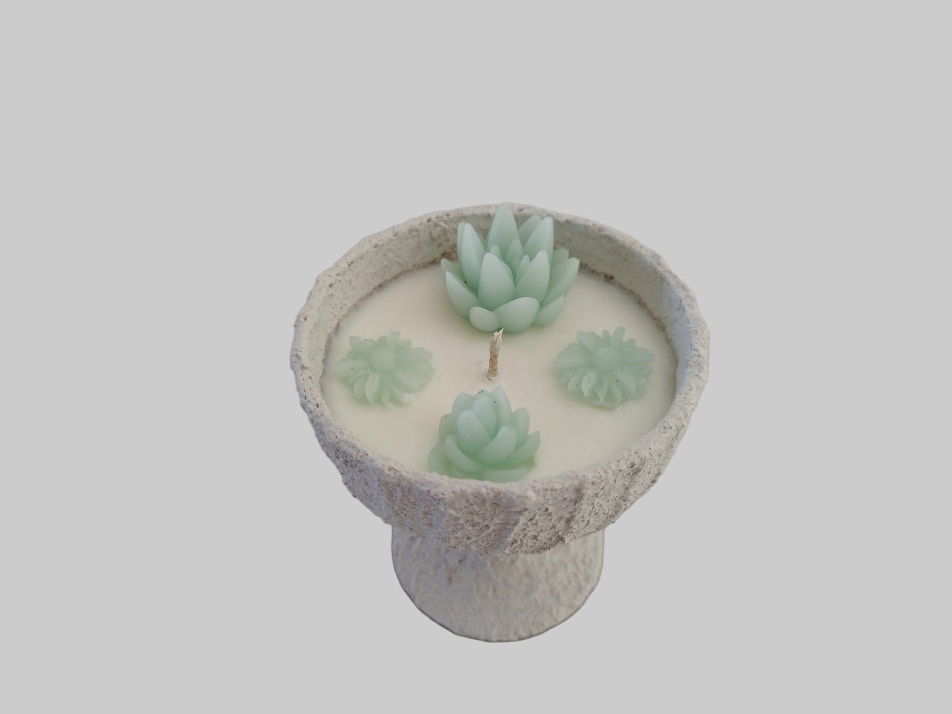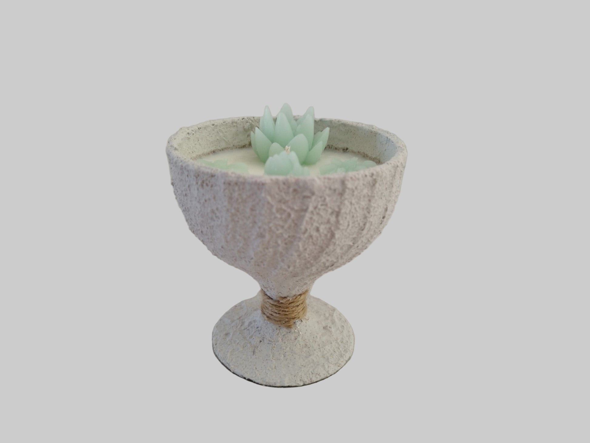Κερί σόγιας σε κομψό ποτήρι με κολονάκι, στοκαρισμένο για αναγλυφή υφή. Στο εσωτερικό του, μικρά κεράκια σε σχήμα λουλουδιού χαρίζουν μια ξεχωριστή διακοσμητική πινελιά.
