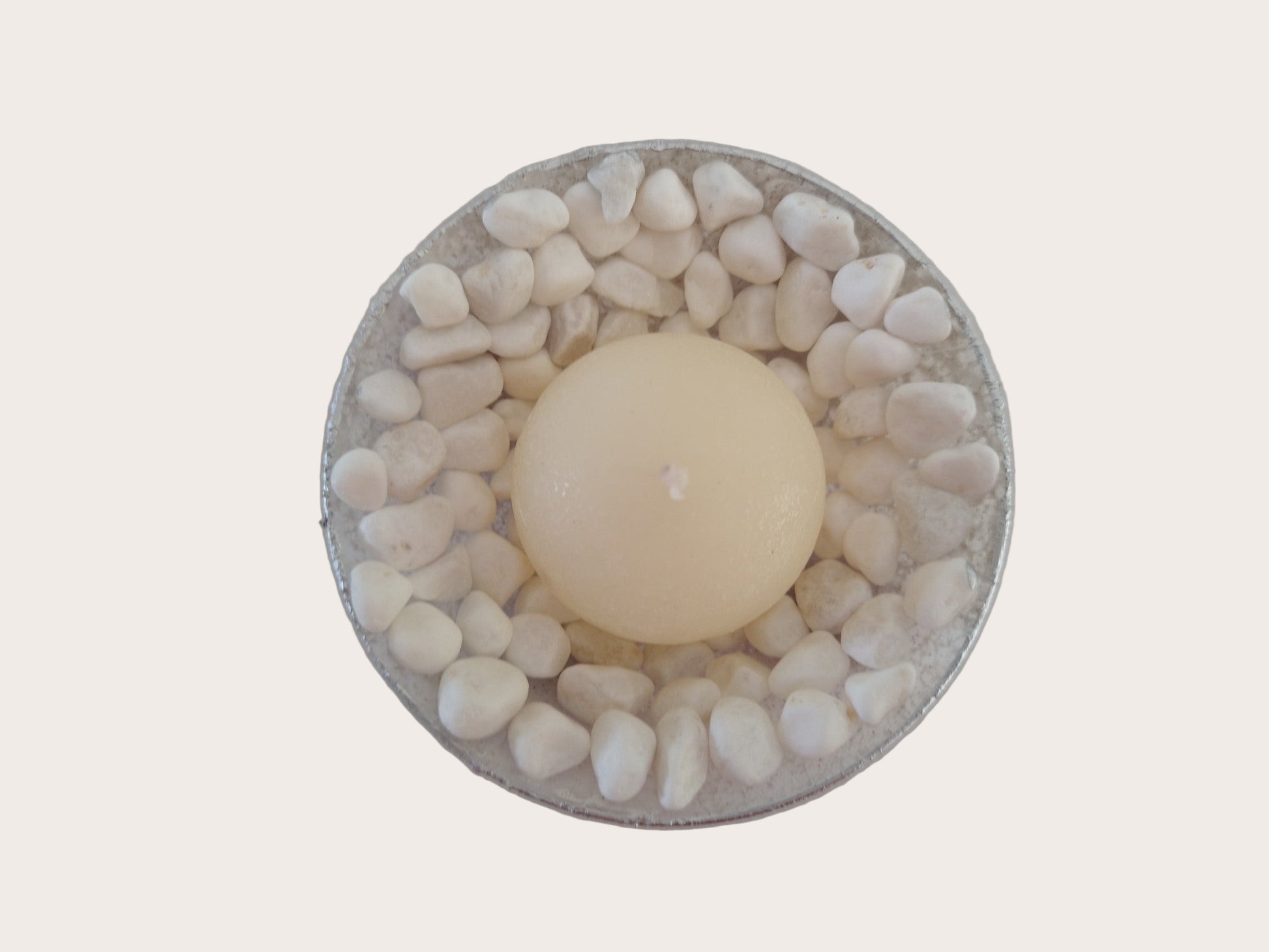 Ποτήρι σαμπάνιας με στοκάρισμα για ανάγλυφη υφή, διακοσμημένο στο κολονάκι με ασημένια κλωστή. Στο εσωτερικό του φιλοξενεί λευκές πετρούλες και ένα στρογγυλό κεράκι, δημιουργώντας μια εκλεπτυσμένη και ρομαντική ατμόσφαιρα.