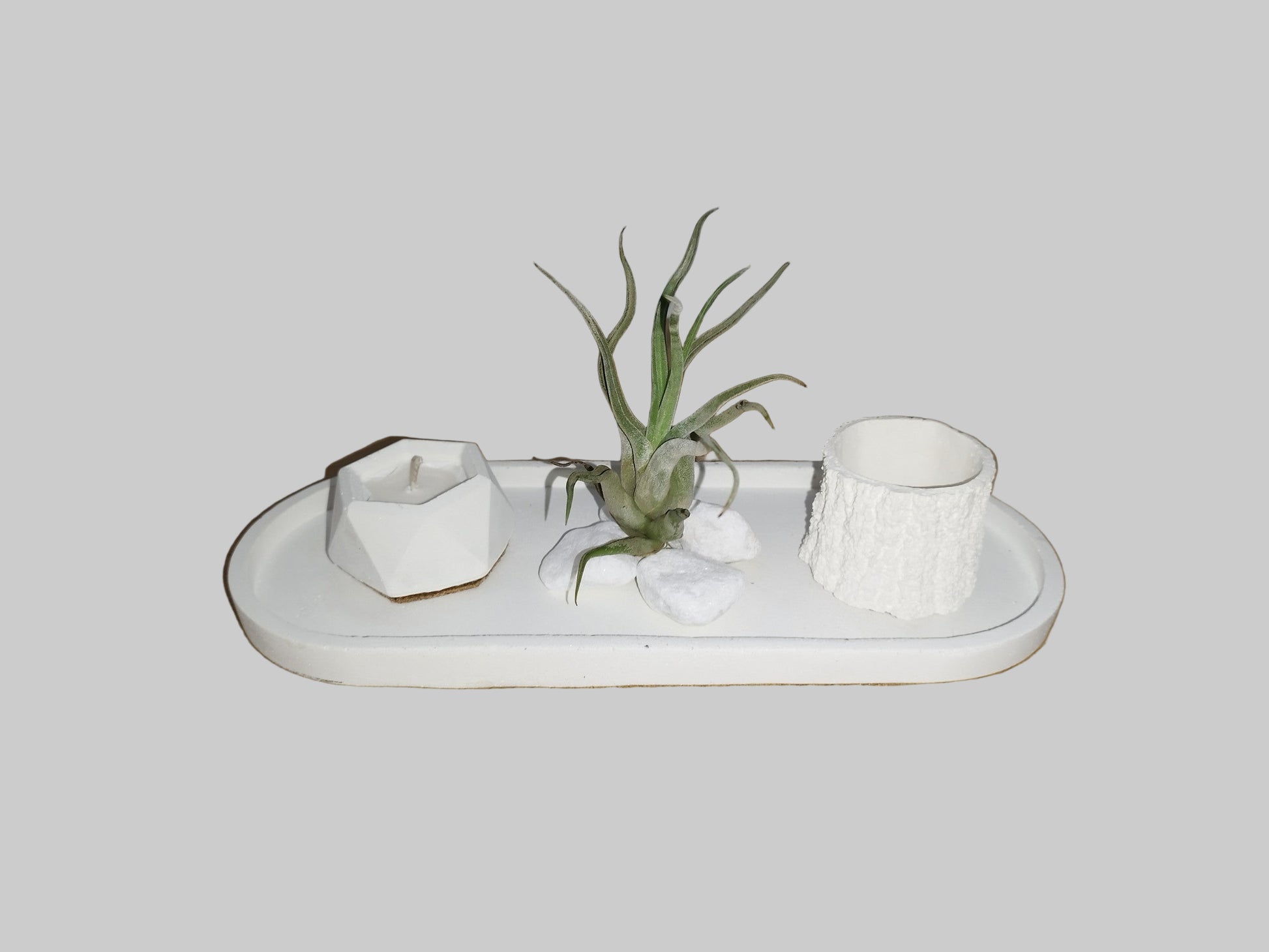 Χειροποίητο διακοσμητικό με ζωντανό αερόφυτο (tillandsia) και κερί από φυσικό κερί σόγιας σε τσιμεντένια βάση. Ένα μοντέρνο κομμάτι που ενώνει τη φρεσκάδα της φύσης με τη ζεστασιά του φωτός και τη γήινη υφή του τσιμέντου.