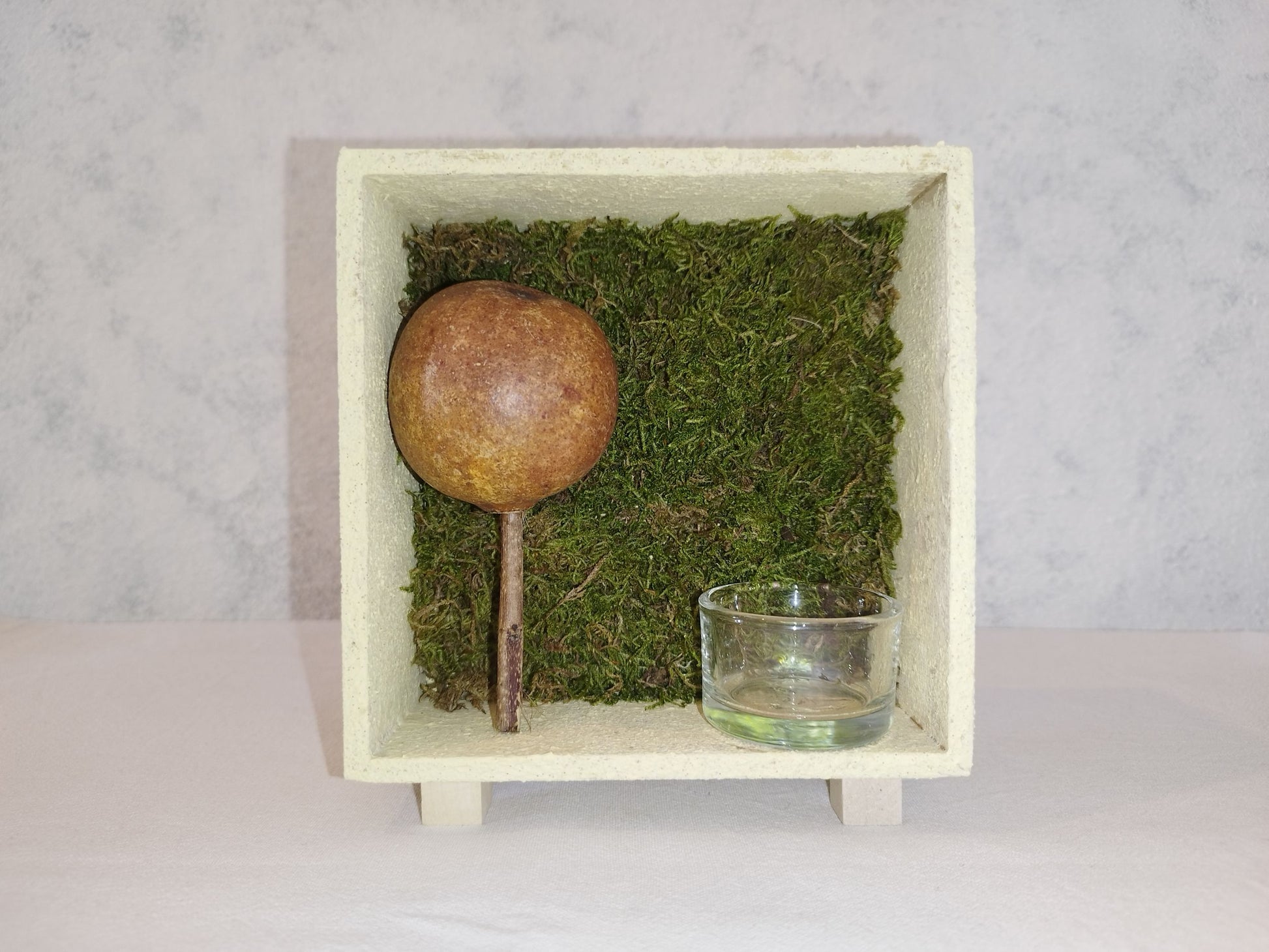 Ένα μικρό παράθυρο στη φύση — το φως του ρεσώ αγκαλιάζεται από αφυδατωμένα βρύα μέσα σε ξύλινο κουτάκι, δημιουργώντας μια ήρεμη και γήινη αίσθηση.
