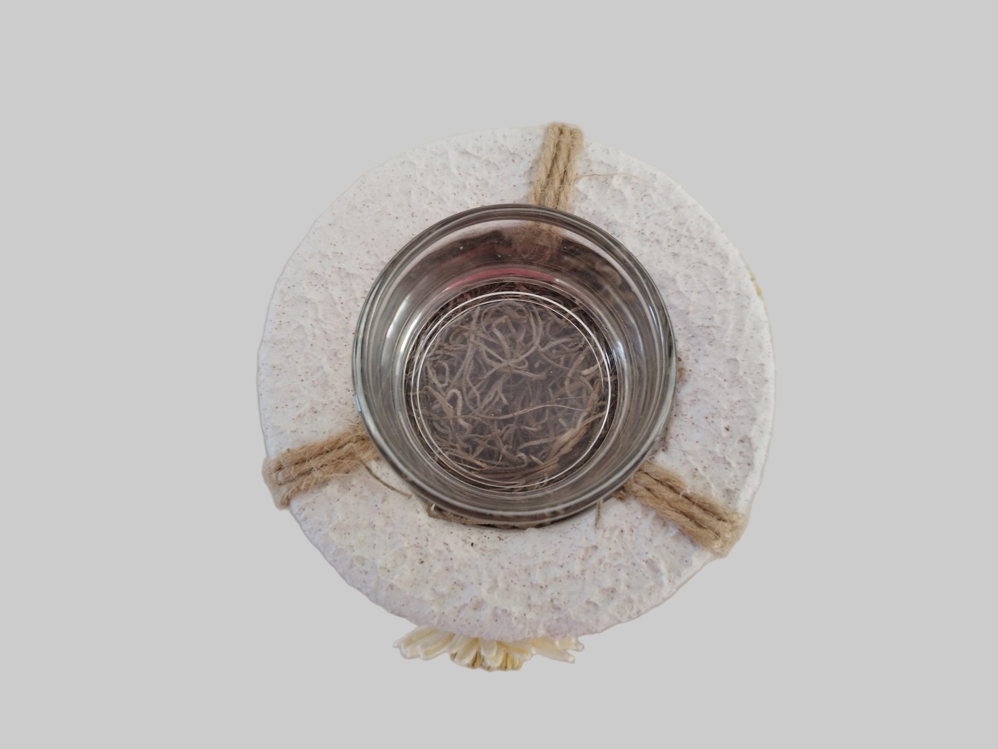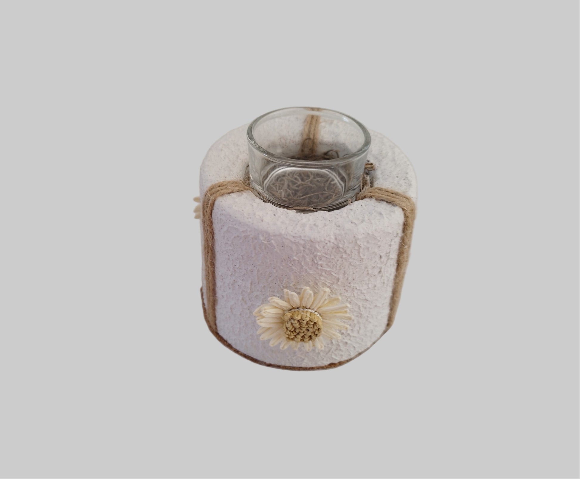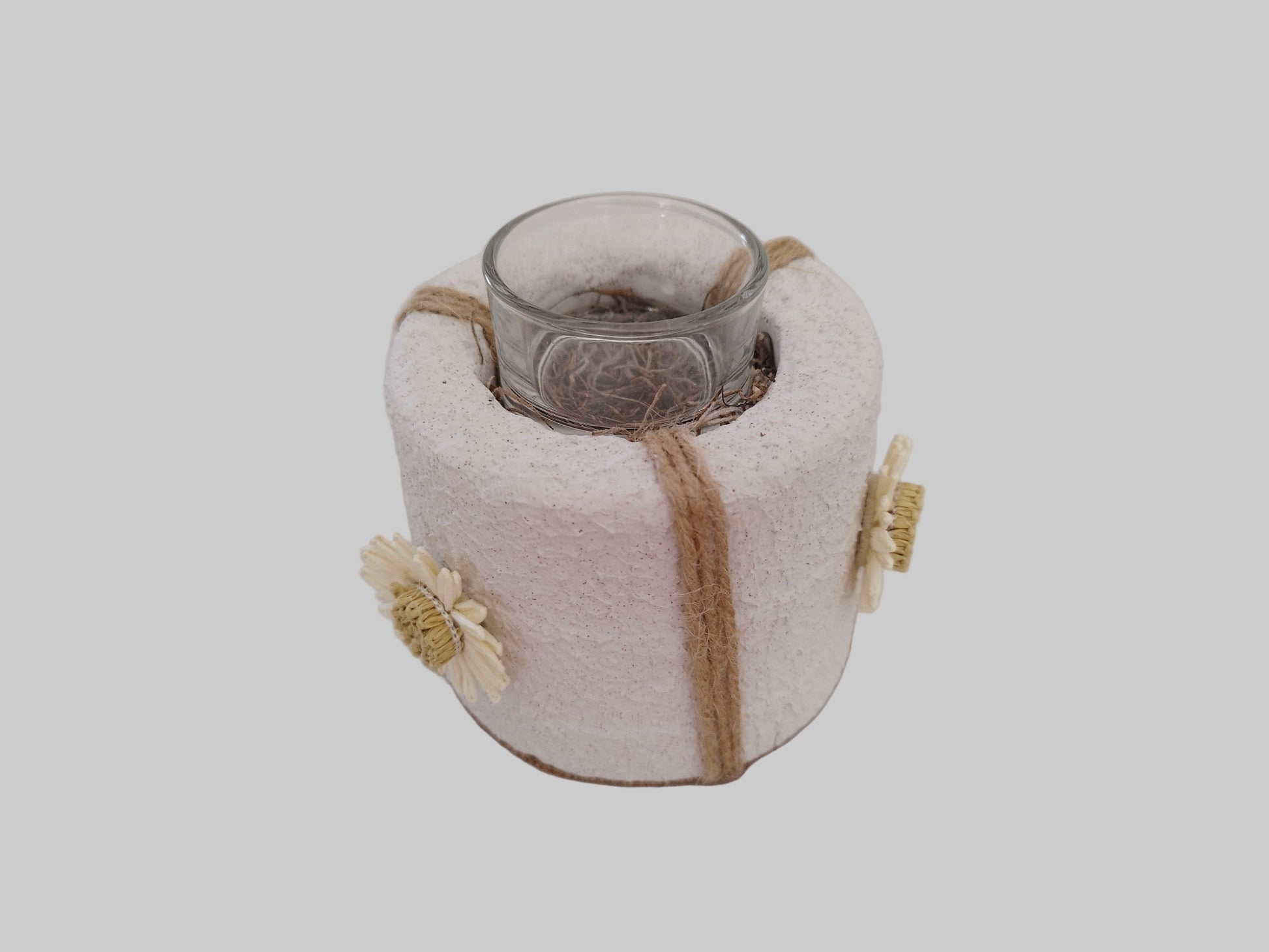 Ρεσώ σε τσιμεντένιο δοχείο, διακοσμημένο με σχοινί και μωβ χάρτινα λουλούδια. Ένα κομψό χειροποίητο κομμάτι που συνδυάζει μίνιμαλ υλικά με ρομαντικές λεπτομέρειες.