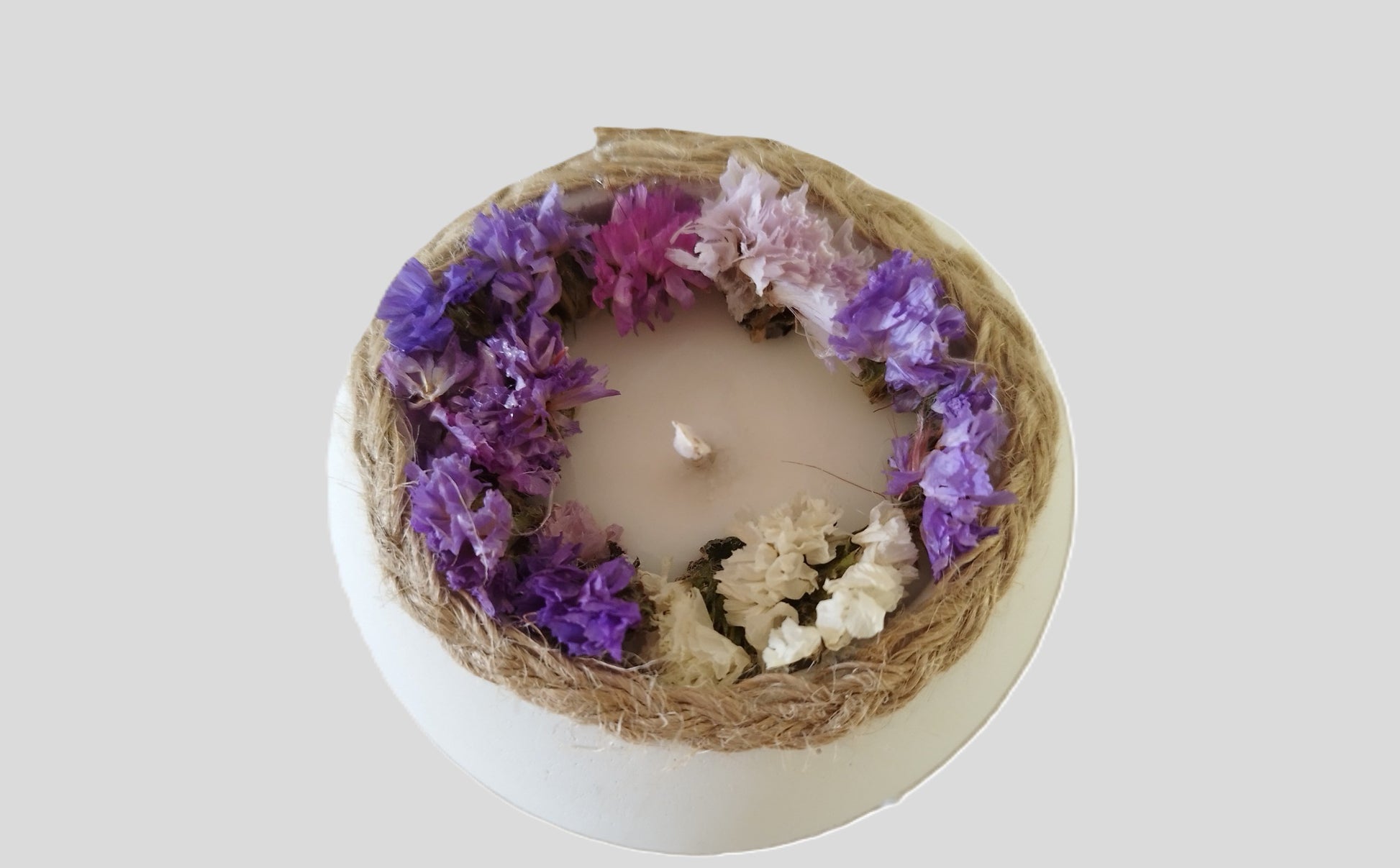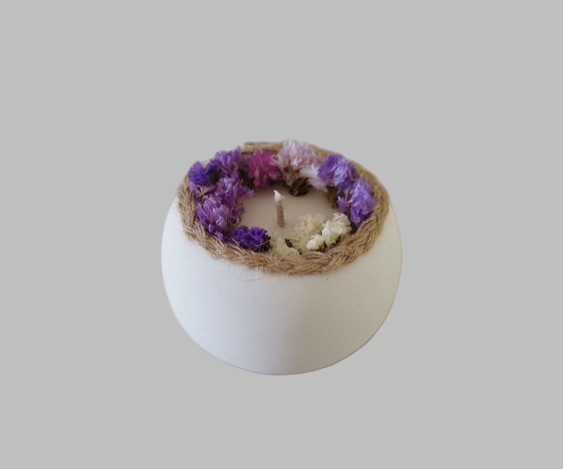 Κερί σόγιας σε λευκό τσιμεντένιο δοχείο, διακοσμημένο με στεφάνι από μωβ και ροζ λουλούδια. Μια κομψή και ρομαντική λεπτομέρεια για τον χώρο σας.