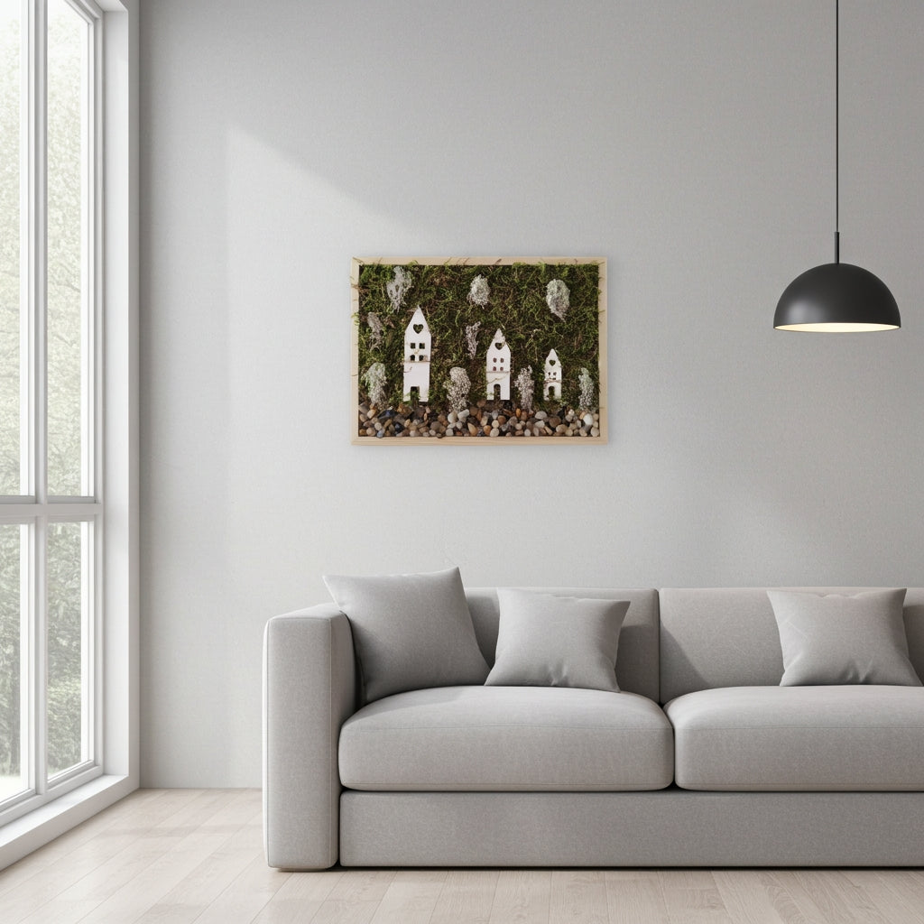 Χειροποίητο καδράκι τοίχου με μίνι τοπίο που περιλαμβάνει διακοσμητικές πετρούλες στη βάση, τρία τσιμεντένια σπιτάκια διαφορετικών μεγεθών και αφυδατωμένα βρύα. Μια μοναδική σύνθεση που δημιουργεί ένα μικρό παράθυρο στη φύση με φυσική και ζεστή αίσθηση.