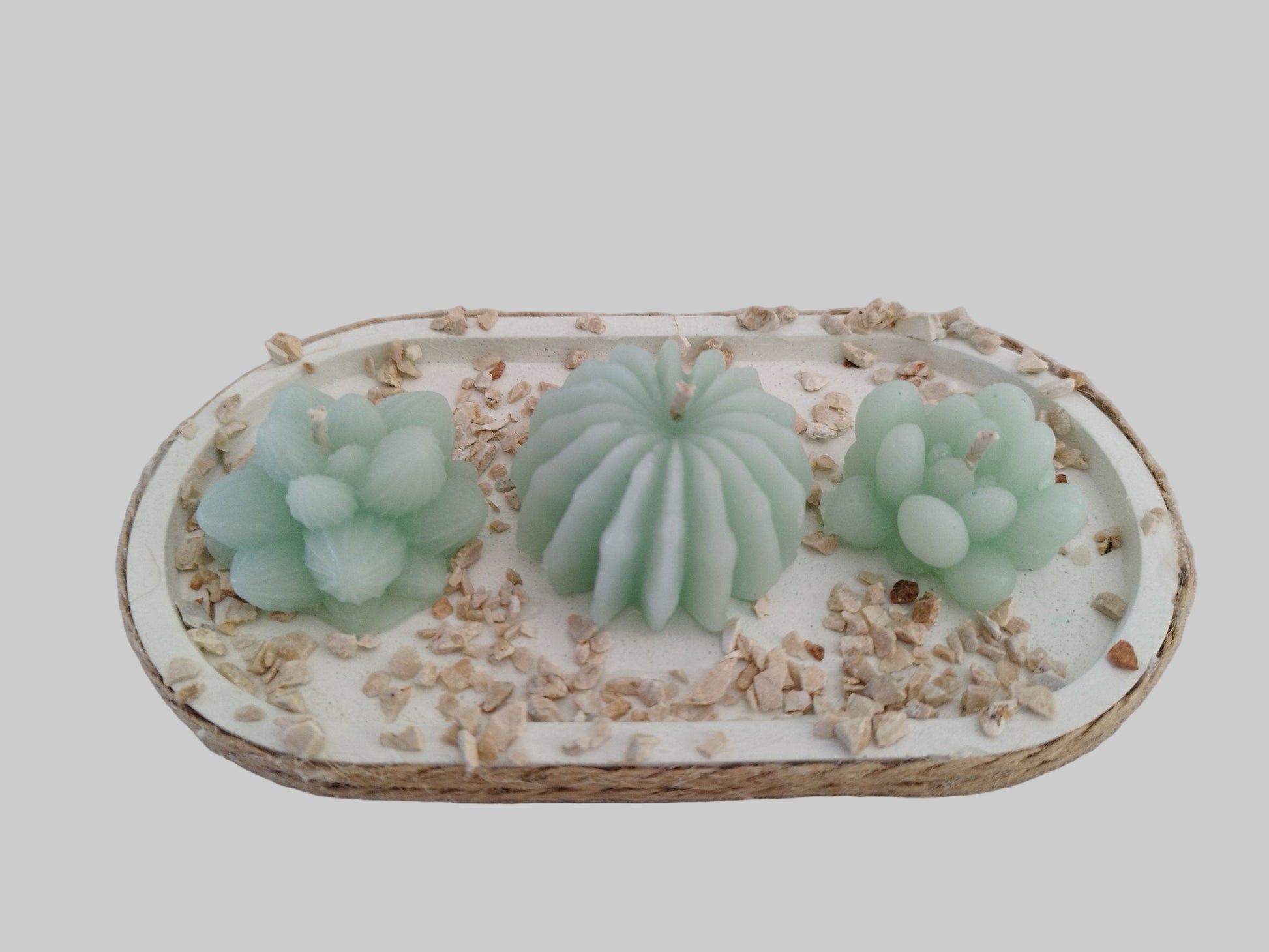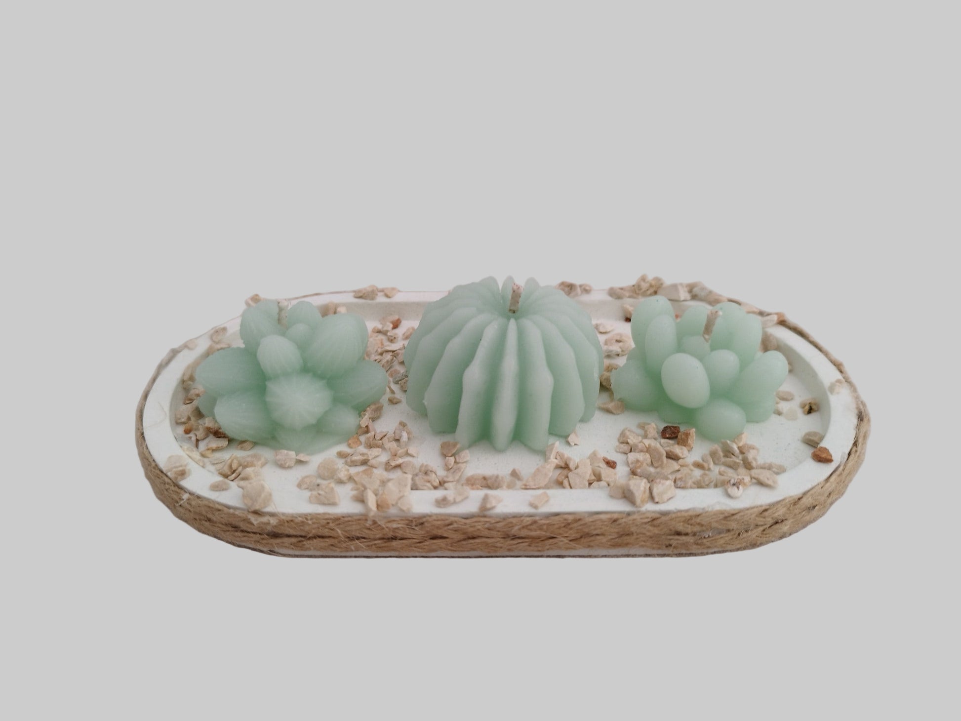 Τρία μικρά κεράκια σε σχήμα κάκτου, τοποθετημένα πάνω σε τσιμεντένια βάση με σχοινί γύρω γύρω και διακοσμημένα με μικρές πετρούλες στο εσωτερικό.