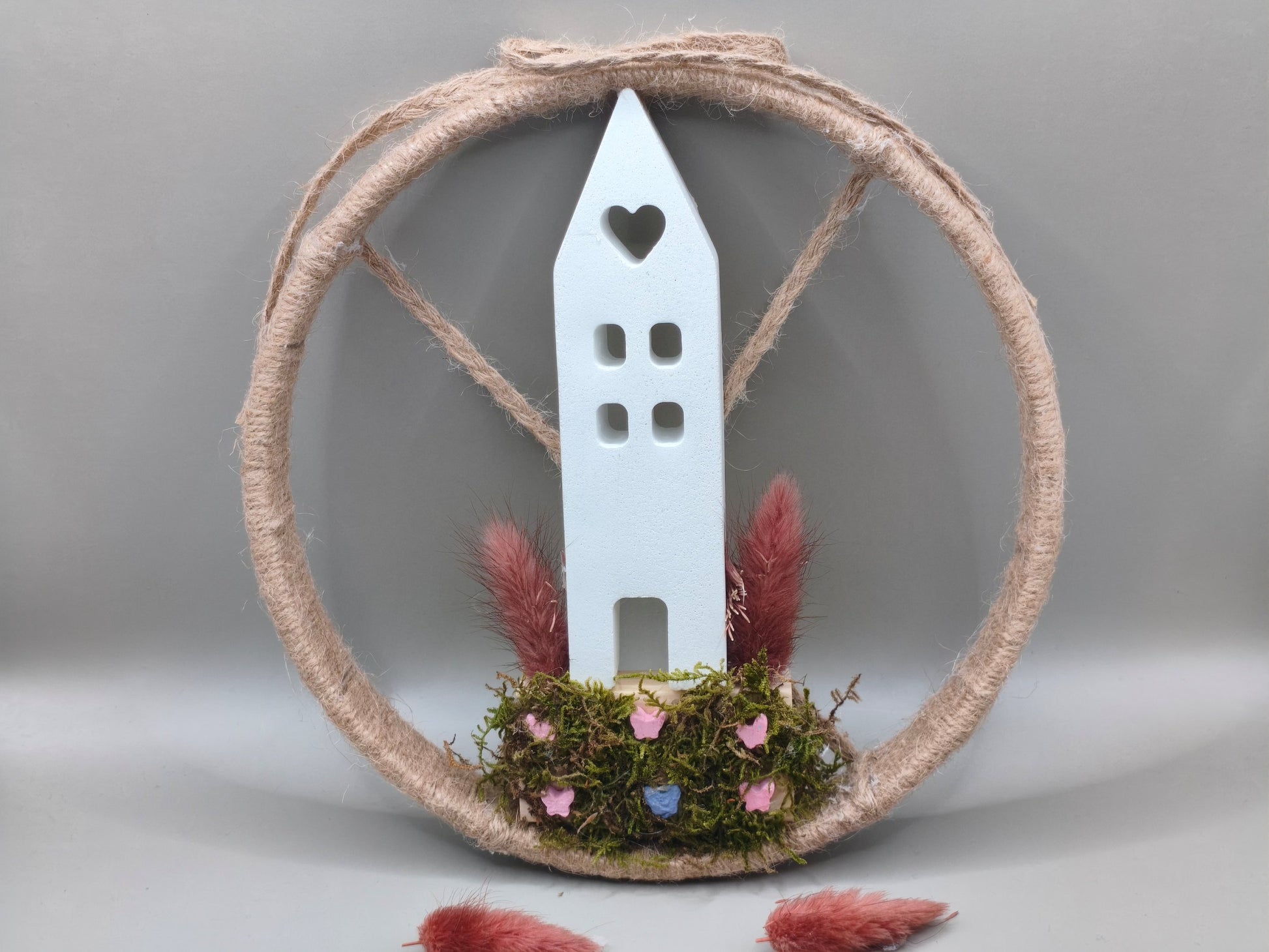 Χειροποίητο ξύλινο κρεμαστό διακοσμητικό με φυσικό σχοινί γύρω γύρω, τσιμεντένιο σπιτάκι στο κέντρο, τσιμεντένιες πεταλούδες στο κάτω μέρος και αποξηραμένα λουλούδια με αφυδατωμένα βρύα. Μια μοναδική σύνθεση που συνδυάζει τη ζεστασιά του ξύλου με τη γήινη υφή του τσιμέντου και τη φυσική ομορφιά των λουλουδιών.