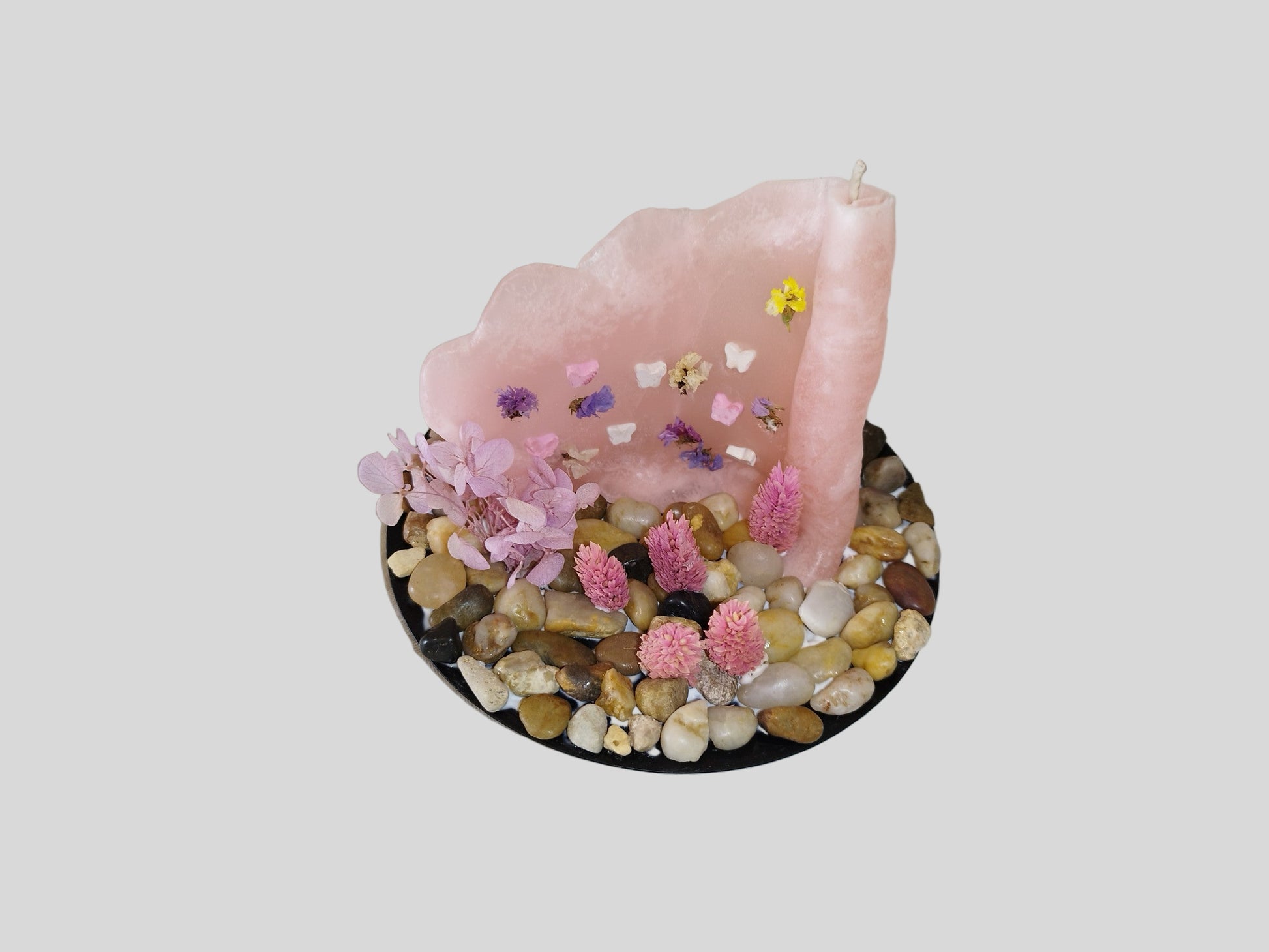 Χειροποίητο ροζ παστέλ κερί,με πεταλούδες από τσιμέντο και αποξηραμένα λουλούδια, πάνω σε μαύρη μεταλλική βάση στολισμένη με πετρούλες και ροζ “δεντράκια”.