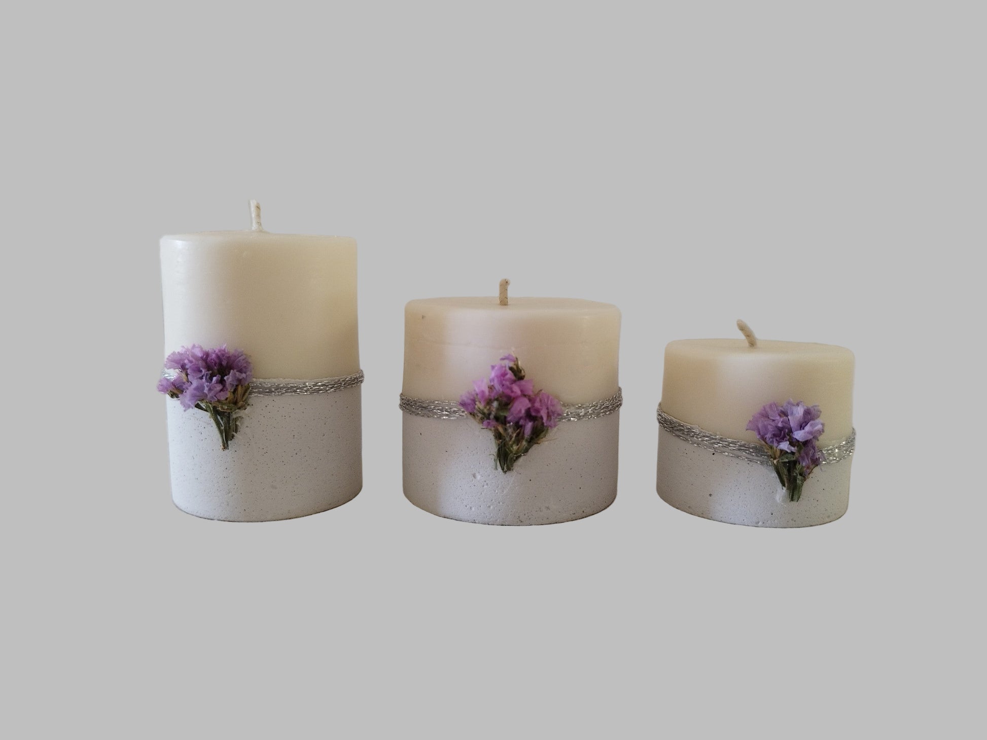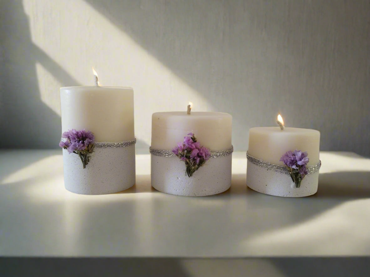 Σετ τριών λευκών κεριών με τσιμέντο, διακοσμημένα με μωβ λουλούδια και ασημένιες κορδέλες. Μια κομψή επιλογή για ιδιαίτερη ατμόσφαιρα.