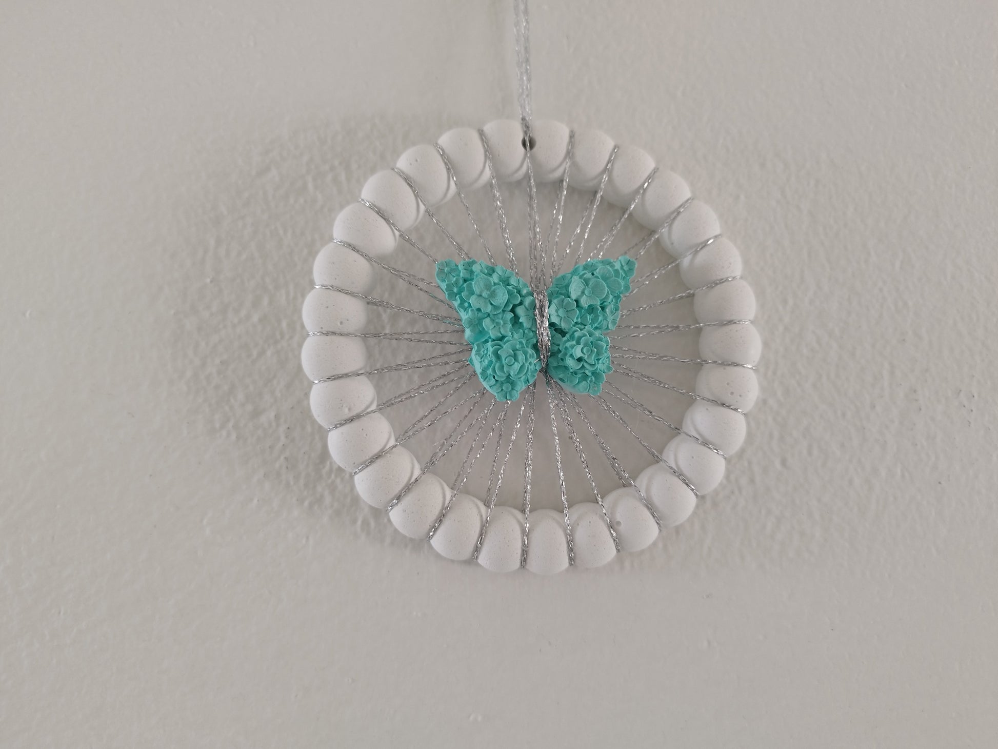 Στρογγυλό τσιμεντένιο περίγραμμα με ασημένιες κλωστές σε στυλ ονειροπαγίδας και στο κέντρο τσιμεντένια πεταλούδα σε τυρκουάζ απόχρωση. Ένα χειροποίητο διακοσμητικό που ενώνει μίνιμαλ ύφος με ρομαντική λεπτομέρεια.