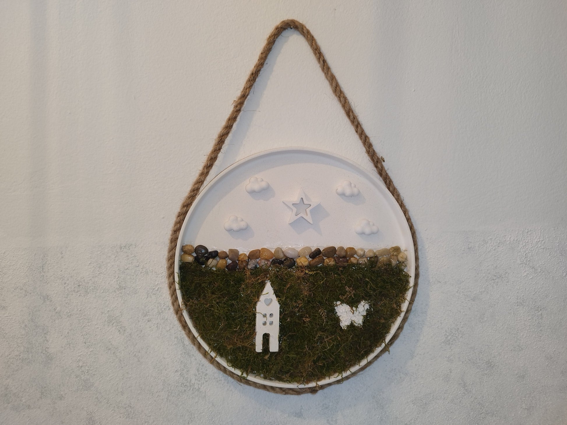Στρογγυλός τσιμεντένιος δίσκος διακοσμημένος με αφυδατωμένα βρύα και τσιμεντένιες φιγούρες ήλιου και σύννεφων. Ένα χειροποίητο διακοσμητικό που συνδυάζει φυσικά στοιχεία με καλλιτεχνική απλότητα.