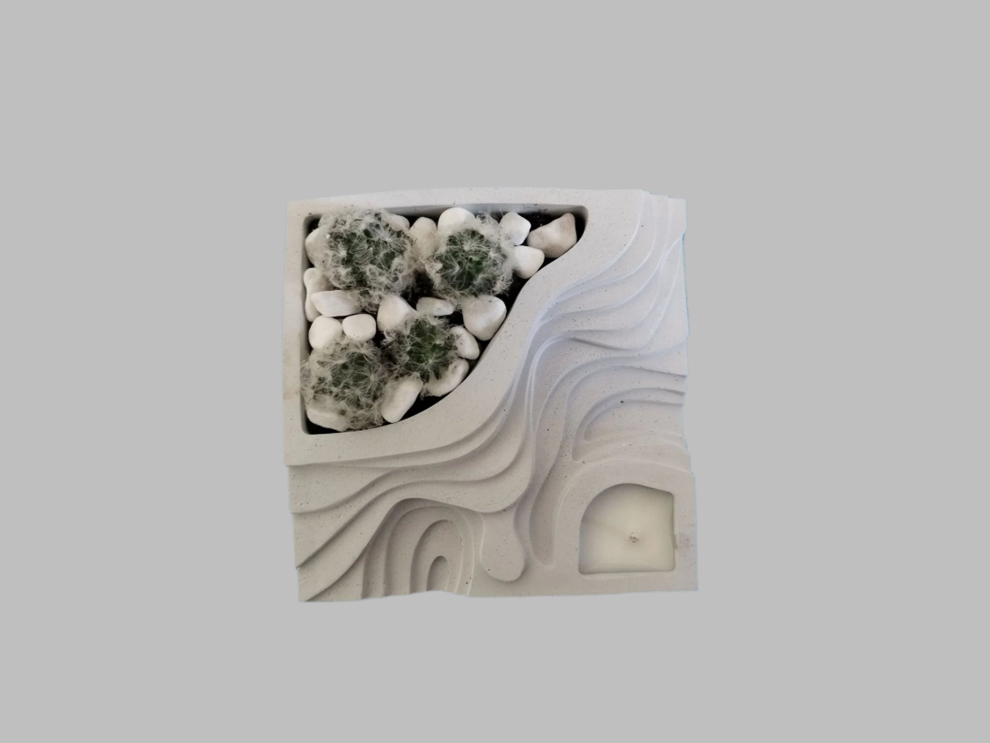 Χειροποίητο τσιμεντένιο διακοσμητικό με παχύφυτα και κερί σόγιας. Ένα κομμάτι που συνδυάζει τη μοντέρνα αισθητική με τη ζεστασιά του φωτός και τη φρεσκάδα της φύσης.
