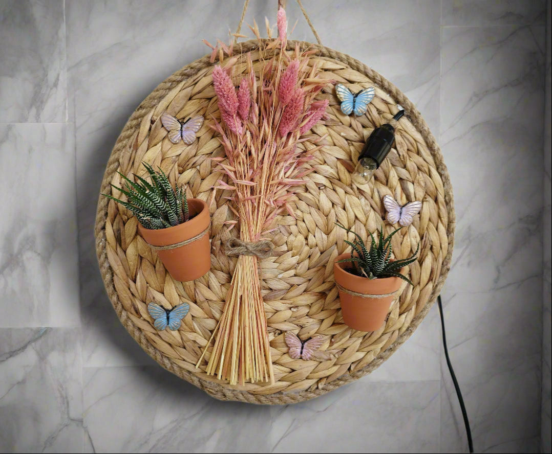 Φωτιστικό τοίχου με παχύφυτα και αποξηραμένα λουλούδια.