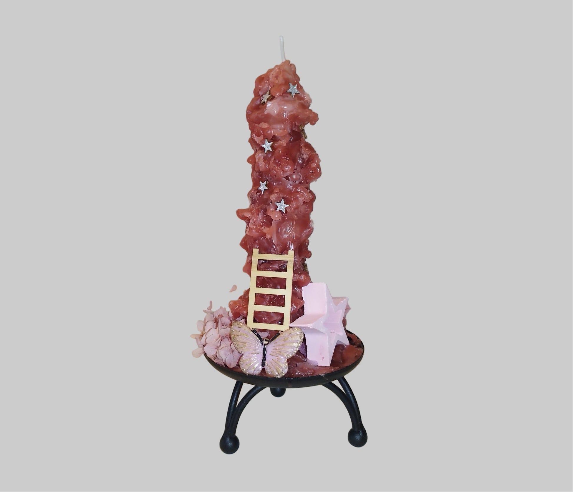 Ένα χειροποίητο κερί σε ακανόνιστο σχήμα, πάνω σε μαύρη μεταλλική βάση.