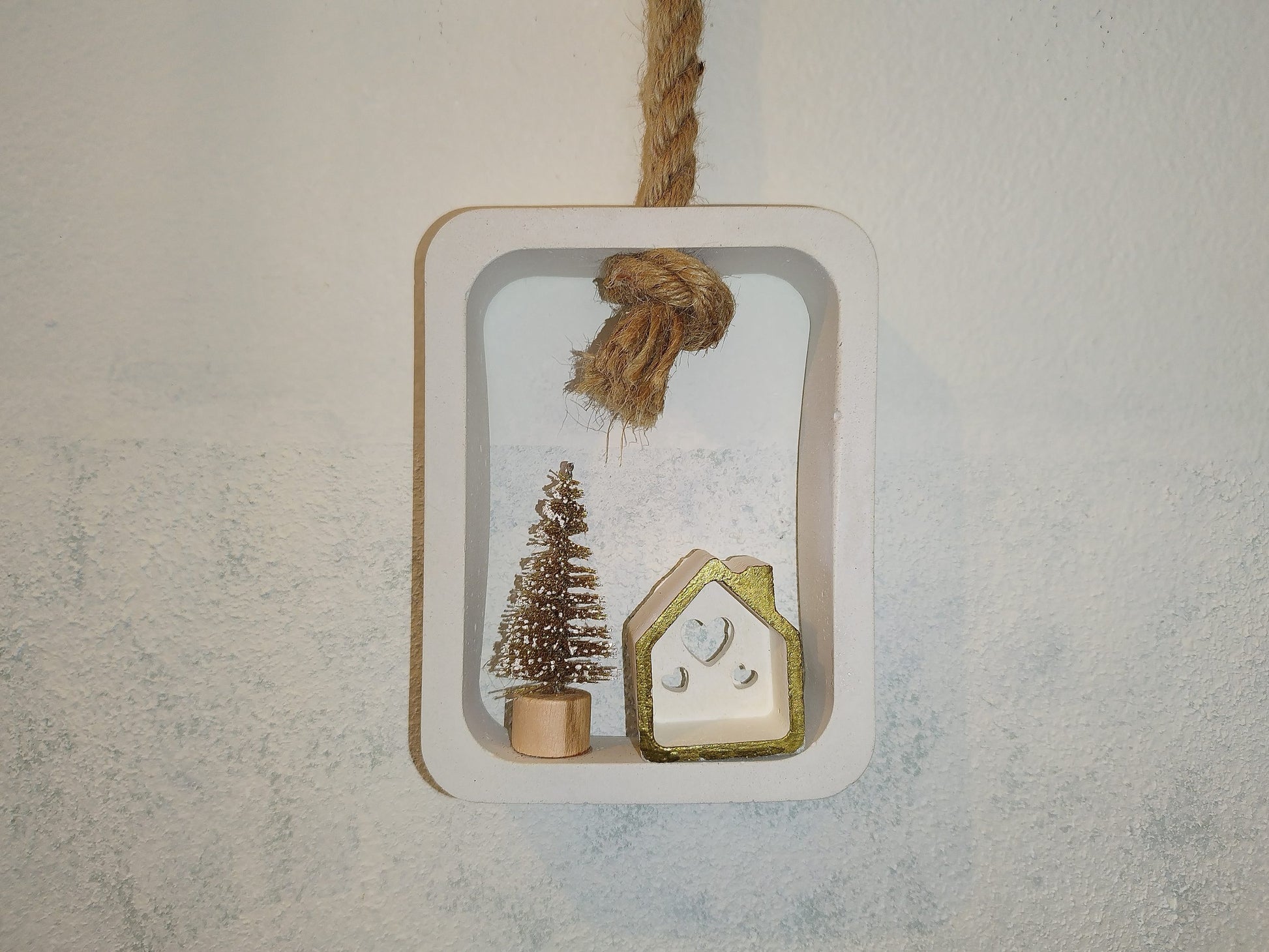 Χειροποίητο τσιμεντένιο διακοσμητικό τοίχου με μικρό τσιμεντένιο σπιτάκι στο εσωτερικό και χριστουγεννιάτικο δεντράκι. Ένα μοναδικό κομμάτι που συνδυάζει τη γήινη υφή του τσιμέντου με τη ζεστασιά της γιορτινής ατμόσφαιρας.